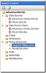 If you are still not sure you are ready to dive into the tutorials we can take a quick peek at portions of the first and sections of the tutorial. Remember, the finished product is a Business Intelligence Development Studio solution. When you create an Analysis Services project AND have satisfied the Data Mining requirements I mentioned above, you will notice a Mining Structures folder as seen under Solution Explorer below: